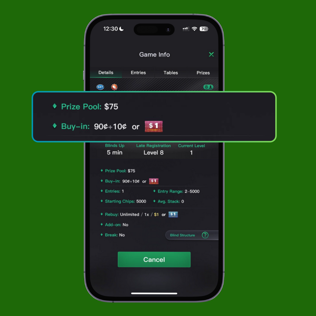 $90с нь шууд шагналын санд орох ба $10с нь тоглоомын хураамж (рейк) болно. Хэрэв та тоглоом эхлэхээс өмнө бүртгэлээ цуцлахаар шийдсэн бол бүх buy-in-г таны аккаунтруу шууд орох болно.