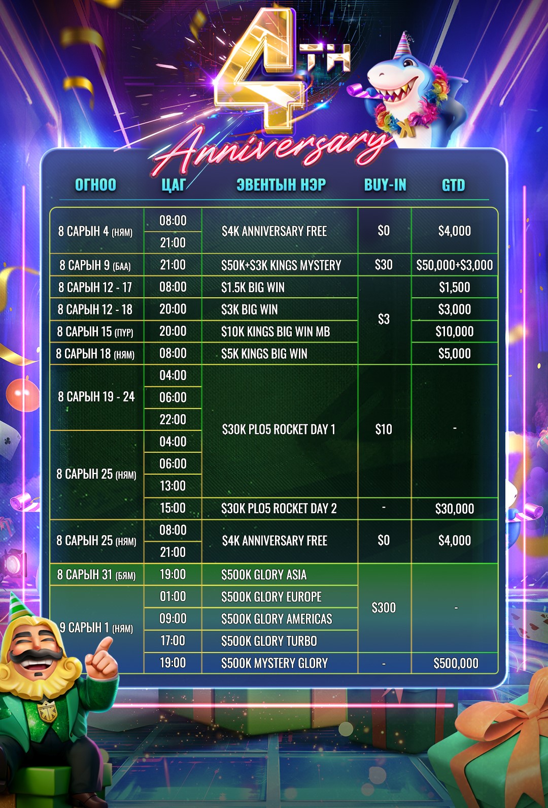 KKPoker 8-р сарын турш 4 жилийн ойгоо тэмдэглэж, тэмцээний шагналын санд $600,000 гаруй баталгаа өгч болно! Ойн баярын арга хэмжээний хүрээнд KKPoker одоог хүртэл хамгийн том Mystery Bounty тэмцээнийг зохион байгуулж байгаа бөгөөд асар их $500,000 GTD шагналын сантай мөн амьдрал-өөрчлөм $100,000 топ нууцлаг шагналыг хүртээх гэж байна! Та энэхүү алдаж боломгүй боломжид тасалбараа даалгавар, giveaways, болон өдөр тутмиын satellites-аар дамжуулан авах боломжтой!