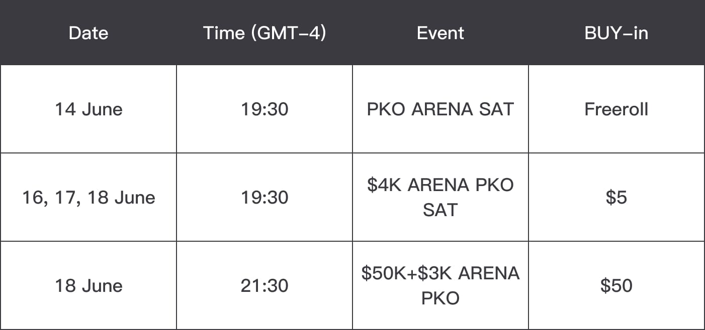 2. $4K ARENA PKO SAT and $50K+$3K ARENA PKO are available to all players.