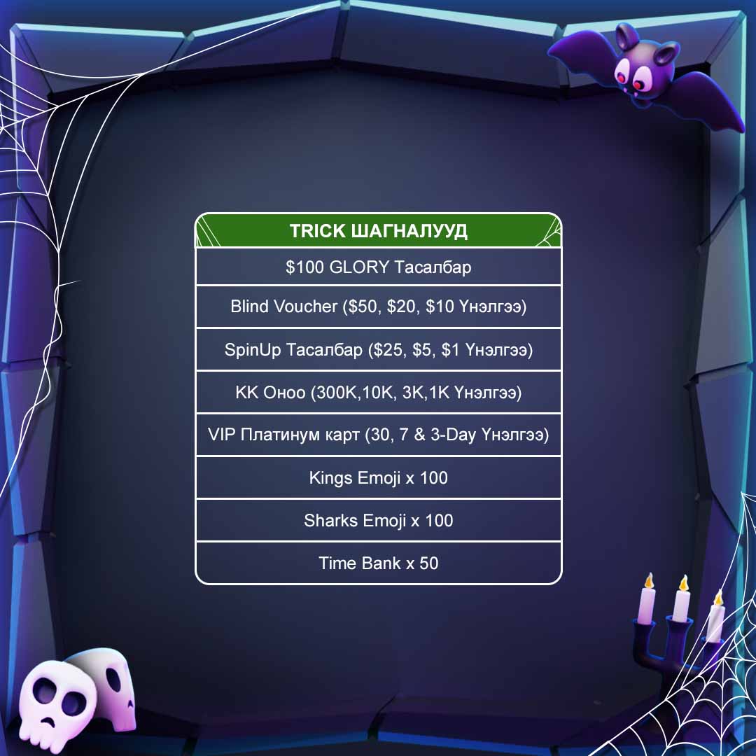2. 50 чихэр цуглуулахын тулд өдөр бүр $3K HALLOWEEN MTT шилдэг 20-д багтаарай. 3. 100 чихэр цуглуулахын тулд өдөр бүр BIG GTD HALLOWEEN-ийн шилдэг 50-д багтаарай.