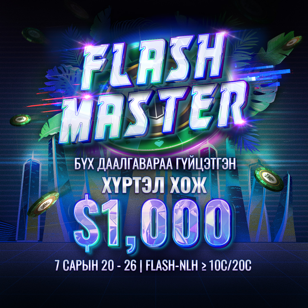 7 сарын 20 – 26-ны хооронд (Blinds ≥ 10c/20c) тоглолтонд гар хожиж, 5 хүртэлх Азын Хүрд болон онцгой FLASH MASTER Хүндэт жаазаа цуглуулаарай!