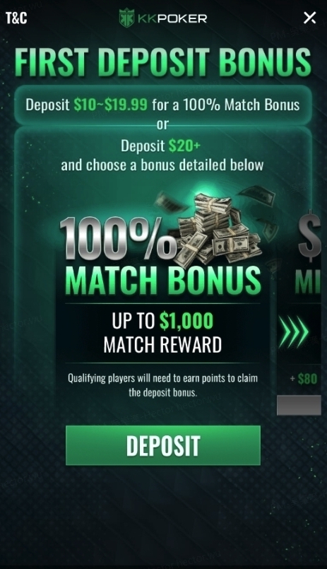 100% дүйцэх Анхны Цэнэглэлтийн Покер Бонус нь KKPoker-д шинээр бүртгүүлсэн, өмнө нь албан ёсны кассаар цэнэглэлт хийж байгаагүй бүх тоглогчдод нээлттэй. Энэ бол танд зориулсан угталтын бэлэг ба мөнгөн покер тоглоом тоглож эхлэх гайхалтай санал юм.