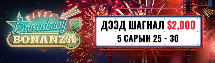 | 10 УДАА FLASH-NLH (Blinds ≥ 10c/20c)-д FLUSH ЮМУУ ИЛҮҮ МОДООР ХОЖ | 5 САРЫН 11 14:00 – 5 САРЫН 16 20:00 | АЗЫН ХҮРД (ДЭЭД ШАГНАЛ $1,000) |