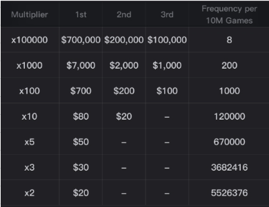 $10 buy-in: 2x, 3x, 5x, 10x, 100x, 1,000x, 100,000x